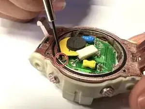 Теперь снимите винт с другой стороны батарейки рядом с желтым цепным компонентом.