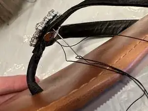 Потяните нитку так, чтобы украшение плотно прилегало к сандалии.