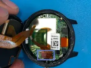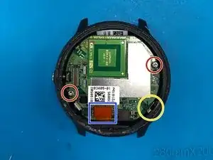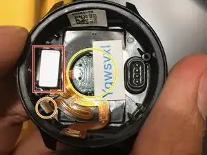 Здесь вы можете заменить батарею при необходимости. Она припаяна через два кабеля к материнской плате часов.