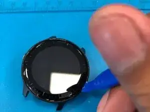 Просуньте лопатку через внешний край экрана. Мы увидим белый клей. Это не должно требовать слишком много силы. Проведение вашего инструмента по краю для удаления клея должно помочь.