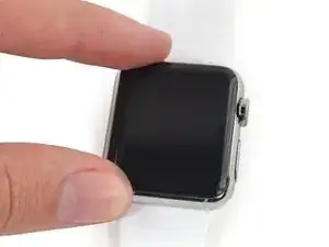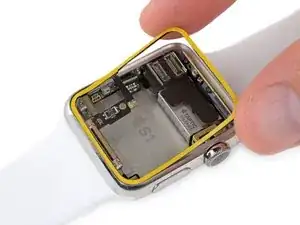 Разогрейте iOpener в микроволновке ещё 30 секунд и приложите его к передней части корпуса часов, чтобы размягчить клей, фиксирующий Force Touch сенсор.