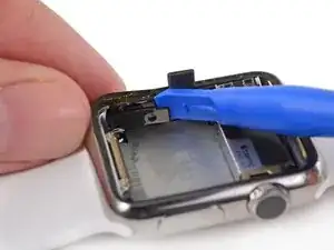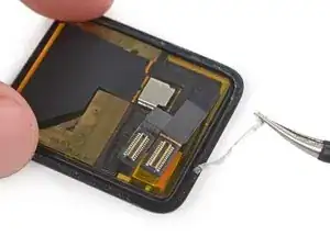 Вверху слева находятся два шлейфа, соединяющие экран с внутренностями часов. Будьте осторожны при поддевании, чтобы не повредить эти шлейфы.