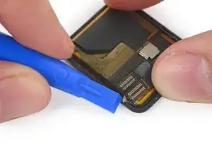 Используйте пластиковый инструмент для вскрытия, чтобы отогнуть разъём кабеля Force Touch сенсора прямо вниз, отсоединив его.
