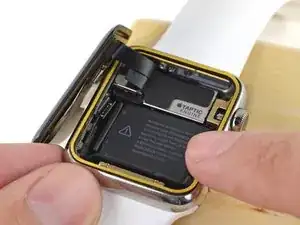 Развернув оголённый клей вниз, аккуратно совместите датчик Force Touch и поместите его в корпус часов.