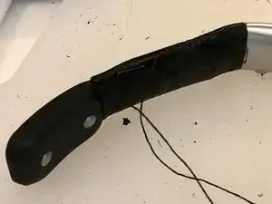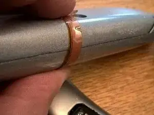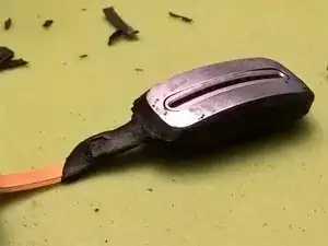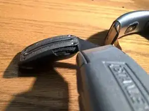 Частично разберите конец с защёлкой аккумулятора: подденьте серебристую лицевую часть защёлки, которая закреплена лентой, выкрутите четыре винта T3 Torx, снимите эту крышку, извлеките аккумулятор.