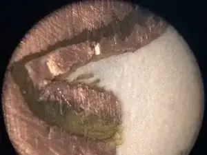 Отшлифуйте ленту, чтобы обнажить проводники с обеих сторон. Будьте аккуратны, чтобы сохранить изолятор между двумя проводниками нетронутым, чтобы они не замкнули. На второй картинке показано увеличение 10× слоёв меди и изолятора.