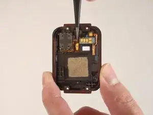 Используя мелкие пинцеты, подденьте кабель динамика, чтобы отделить его от задней крышки. Убедитесь, что подходите к нему как на изображении, иначе он может не сняться аккуратно.