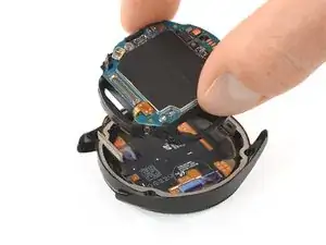 Используйте палец, чтобы равномерно надавить на дисплей через металлический корпус часов, чтобы ослабить клей.