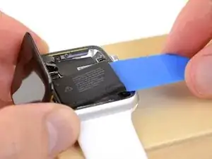 В более крупных моделях (42 мм) возможно случайное поддёвание системной платы под аккумулятором. Вставляйте лопатку только до тех пор, пока она не окажется под аккумулятором, но не под системной платой.