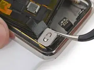 Возле верхнего левого угла находятся два кабеля, соединяющих экран с внутренней частью часов. Будьте осторожны при поддёвании, чтобы не повредить эти кабели.