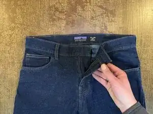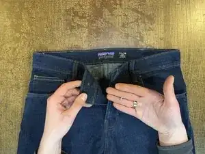 Расстегните молнию и откройте джинсы на поясе, чтобы увидеть отверстие, где отсутствует кнопка.
