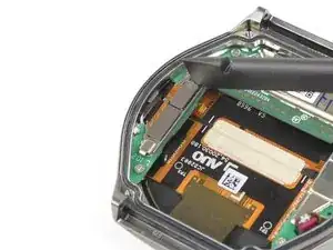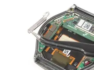 Используйте пинцет, чтобы сдвинуть кронштейн межсоединительного кабеля вниз и влево, чтобы отщёлкнуть его.