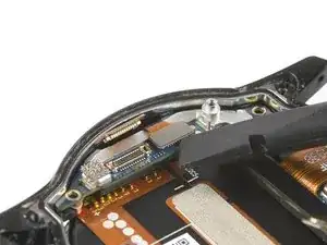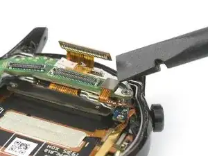 Используйте плоский конец лопатки, чтобы приподнять и отключить левый гибкий кабель дисплея.