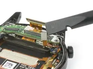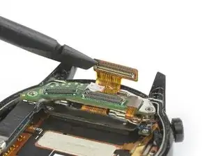 Используйте плоский конец лопатки, чтобы приподнять и отключить гибкий кабель кнопок часов от дополнительной платы.