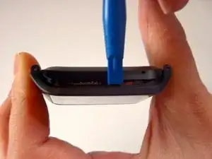 Поместите пластиковый инструмент для открывания под материнскую плату в этом месте. Осторожно подденьте материнскую плату от передней крышки. Она должна отпрыгнуть и освободиться от крышки.