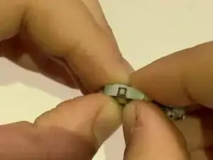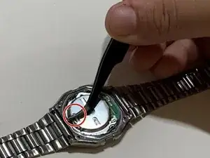 С помощью пинцета потяните маленькую металлическую защёлку и извлеките внутреннюю часть часов.