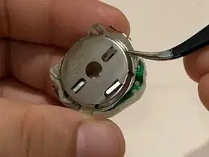 Подденьте пинцетом металлические зажимы в каждом углу и снимите держатель батарейки.