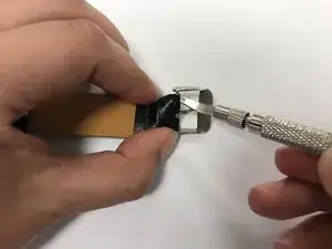 Используйте раздвоенный конец инструмента для пружинных штифтов, чтобы надавить штифт вниз и сдвинуть металлическую пряжку поверх него.
