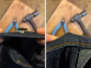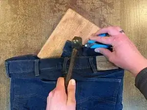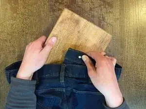 Переверните джинсы и поместите под пуговицу мягкую плоскую поверхность для работы, например мягкий кусок дерева или кожу.