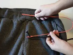 Продвигайте и тяните тупой конец нитенаправителя через второе отверстие спортивных штанов.