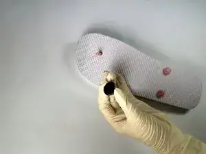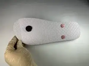 Приклейте накладку к дну шлепанца прямо под отверстием, где проходит пост для пальцев.