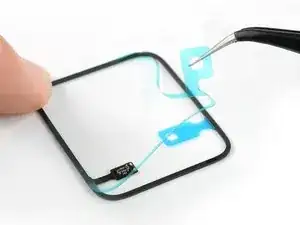 Используйте пинцет, чтобы аккуратно снять синюю защитную плёнку сверху уплотнителя Force Touch, обнажая оставшийся клей.