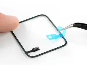 Используйте пинцет, чтобы аккуратно снять синюю защитную плёнку с нижней части запасного уплотнителя Force Touch, обнажая клей под ней.