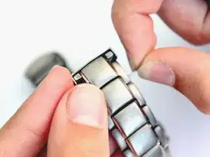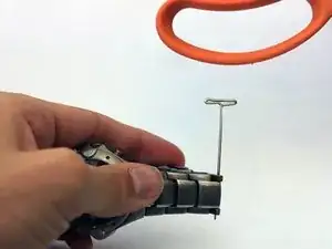 Ударьте по толкающему штифту тупым предметом (мы использовали ножницы), пока маленький металлический стержень не выйдет из звена.