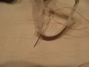 Проткните иглу с изнаночной стороны примерно в 2 мм от верхнего края через оба конца резинки.