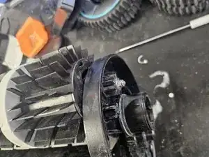 Положите устройство на бок, затем снимите чёрную пластиковую заглушку с колёс.