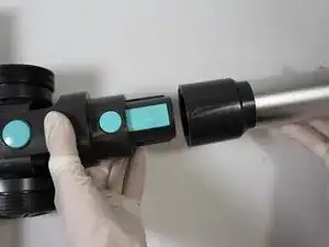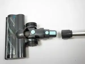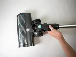 Нажмите на синюю кнопку и потяните, чтобы отсоединить насадку от корпуса пылесоса.