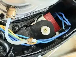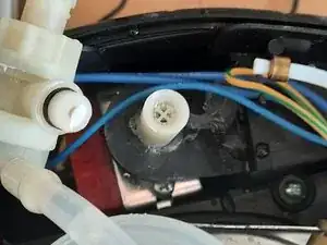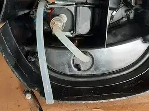 Найдите белый пластиковый трёхходовой клапан в верхней задней части машины. Это клапан сброса давления, который контролирует давление воды, поступающей в бойлер, с помощью простого пружинного механизма. Избыточная вода возвращается в резервуар по прозрачной пластиковой трубке.