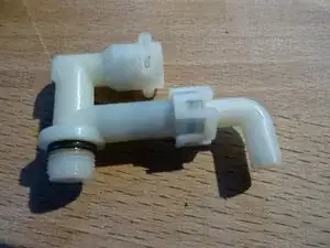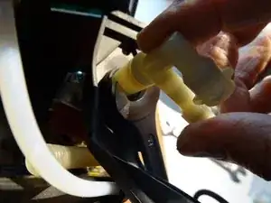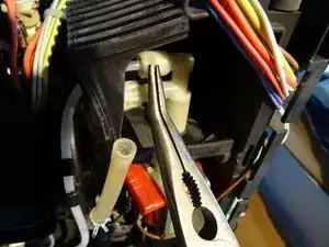 Снимите два шланга с клапана. Для более толстого шланга нужно сжать хомут плоскогубцами, сдвинуть его и затем можно снять шланг.