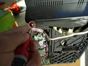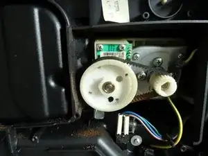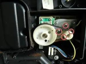 Снимите четыре винта с крестообразным шлицем, крепящие мотор. (Два на фото скрыты). Ослабьте мотор и немного сдвиньте его вверх.