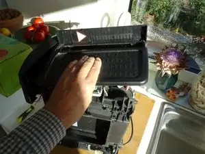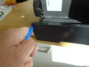 Слева панель немного застряла. Вставьте пластиковый инструмент для открывания в зазор между передней и левой боковой панелью выше отверстия для резервуара воды. Немного расширьте зазор.