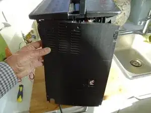 Затем поместите инструмент в зазор между передней и левой боковой панелью под отверстием для резервуара воды. Увеличьте зазор и сдвиньте боковую часть примерно на 2 см назад.