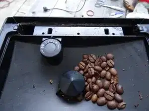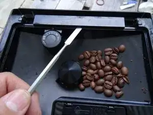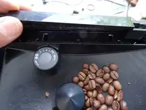 Дверца отсека для зерен должна быть снята. Она фиксируется с обеих сторон, фиксация удерживается под напряжением пружиной. Сожмите пружину, пока замок не освободится, и поднимите дверцу.