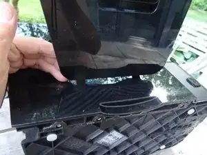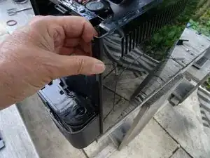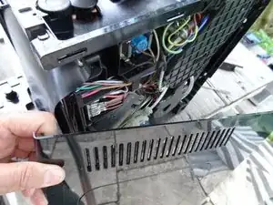 Боковые крышки все еще прикреплены к задней панели двумя винтами. Они находятся под накладкой, которая просто защелкнута. Снимите накладку и уберите в сторону.