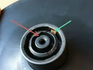 Изображение показывает электрические контакты в подставке. Зелёная стрелка (более удобно фотографировать) указывает на хороший яркий медный контакт для внешнего кольца, а красная стрелка показывает положение меньшего глубокого контакта для внутреннего кольца (трудно фотографировать).