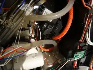 Два прозрачных шланга ненапряжённые, левый идёт к впуску для подачи воздуха в капучинатор, правый — в расширительную камеру для слива остатков воды.
