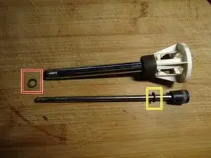 Вал можно вытолкнуть из втулки с обоих концов. Однако снизу мешает маленький стопорный штифт, а сверху — резиновая муфта. Муфта закручена. Обе детали можно снять.
