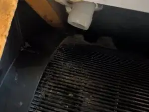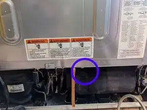 К сожалению, я уже удалил трубку с этого фото, но вы увидите трубку на следующих изображениях. Она вертикально укреплена в этом месте. Есть жесткая пластиковая трубка, которая ведет в холодильник, и прокладка, соединяющая сливной трубопровод с показанной деталью.