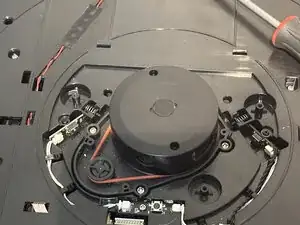 Лазерный сканер имеет красный резиновый ремень, который крепится к маленькому колесу, заставляющему сканер вращаться. Ремень сошел с колеса. Просто наденьте ремень обратно на колесо.