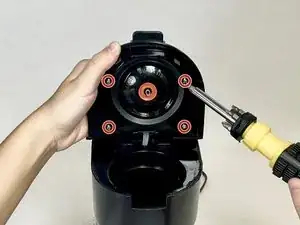 Отверткой Phillips удалите четыре винта 7 мм на основании кофеварки.