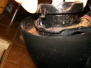 Держатель K-cup просто вытягивается вверх. Может быть небольшое сопротивление от пружинных защёлок. Слой чешуек на самом деле — кофе из многоразовых фильтров K-cup.