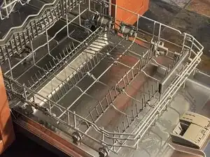 Задвиньте корзину для посуды обратно в посудомоечную машину, убедившись, что колёсики правильно совмещены с направляющей перед тем, как толкнуть её внутрь.