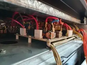 За местом, где была панель управления/дисплея, вы увидите плату с небольшими, незакрытыми реле. (Почему они не защищены от пыли и тепла в устройстве за несколько тысяч долларов — загадка!)