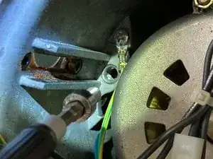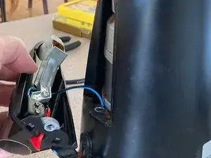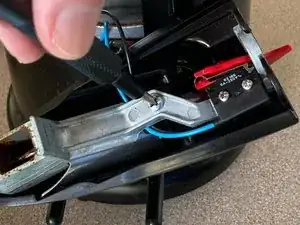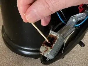Поднимите узел спускового механизма от основного корпуса, снова осторожно обращаясь с проводкой для выключателя спуска. Для работы можно опереть узел на упор для портафильтра, чтобы не создавать натяжения на проводку.