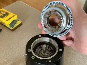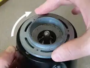 Снимите верхнюю шлифовальную пластину (жернов), удерживая замок регулировки помола большим пальцем и поворачивая жернов по часовой стрелке, чтобы его открутить.