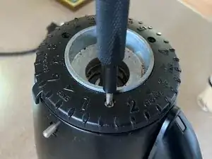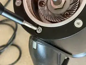 Отвёрткой PH1 открутите три (3) винта, фиксирующие кольцо регулировки помола на верхней части устройства, затем снимите кольцо.